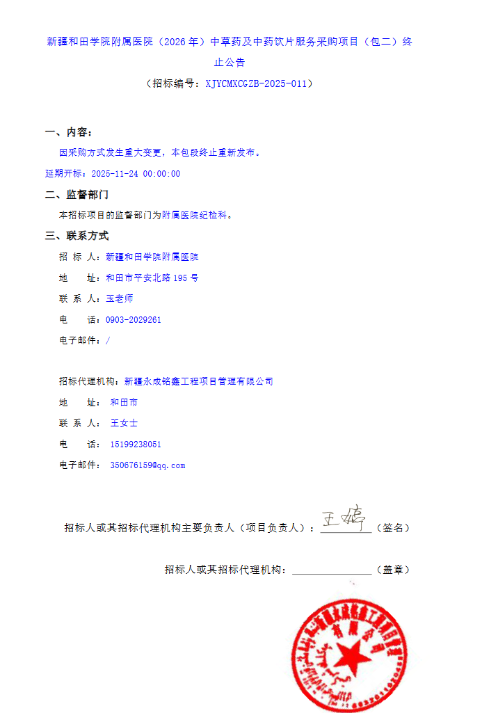 【新疆和田学院附属医院】新疆和田学院附属医院(2026年)中草药及中药饮片服务采购项目(包二)终止公告