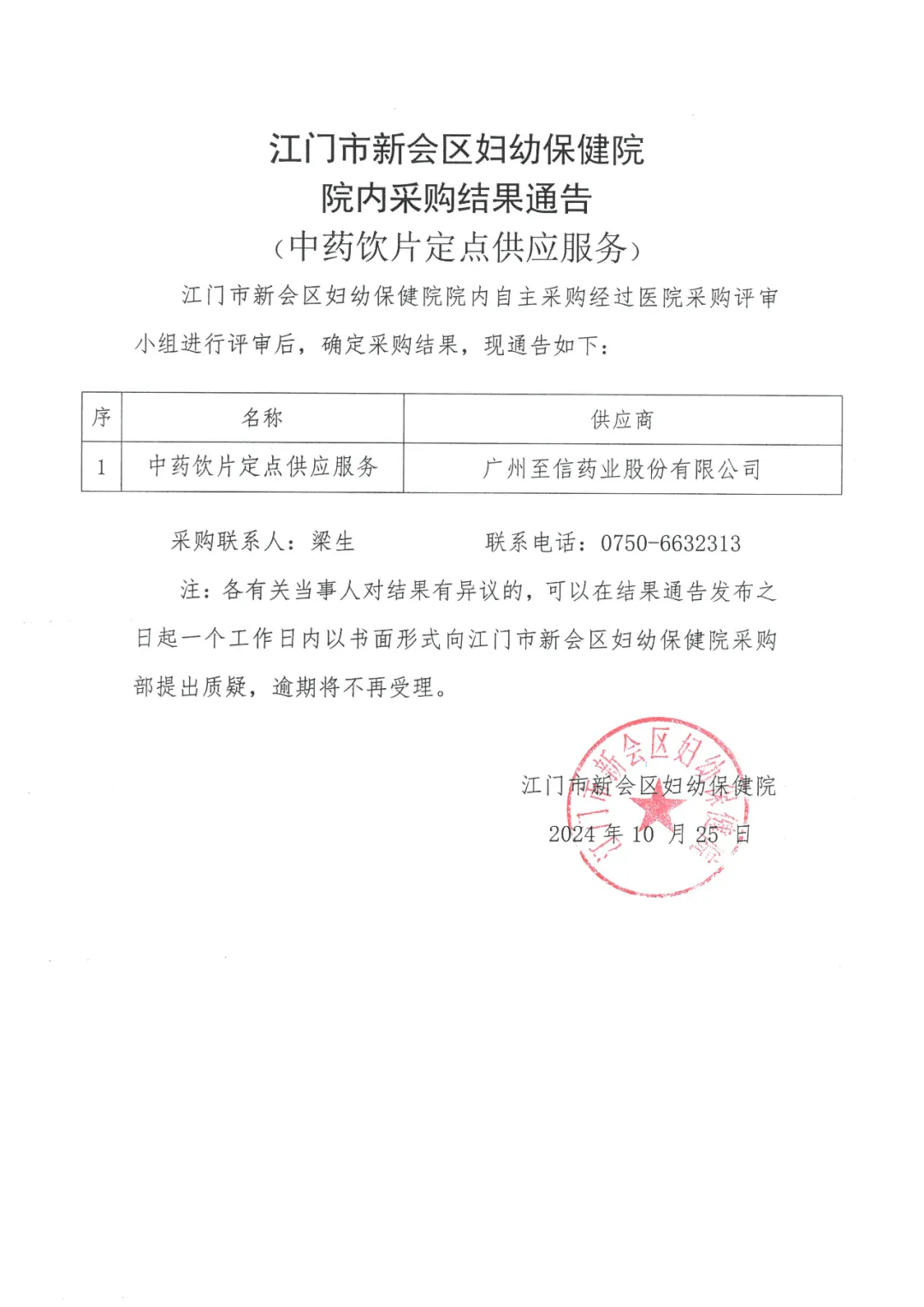 【江门市新会区妇幼保健院】广东省江门市新会区妇幼保健院院内采购结果通告(中药饮片定点供应服务)