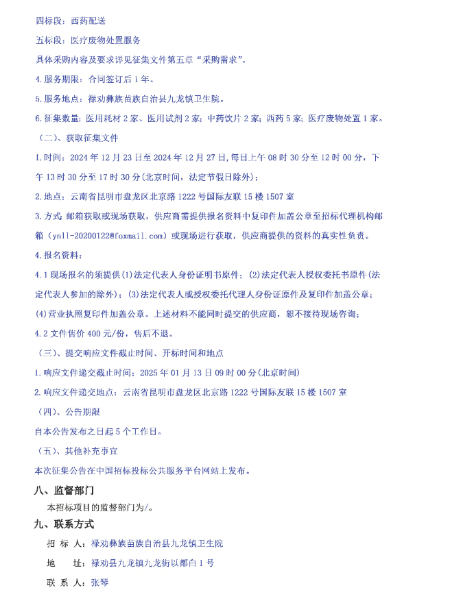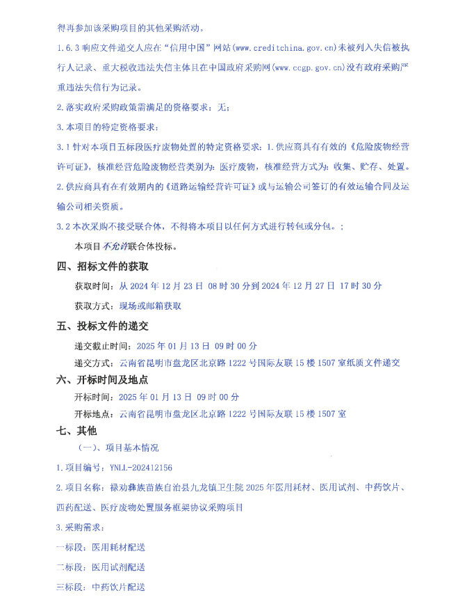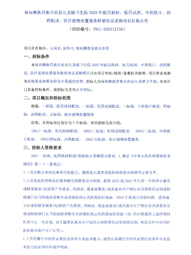 【昆明市禄劝彝族苗族自治县九龙镇卫生院】云南省昆明市禄劝彝族苗族自治县九龙镇卫生院2025年医用耗材、医用试剂、中药饮片、西药配送、医疗废物处置服务框架协议采购项目征集公告