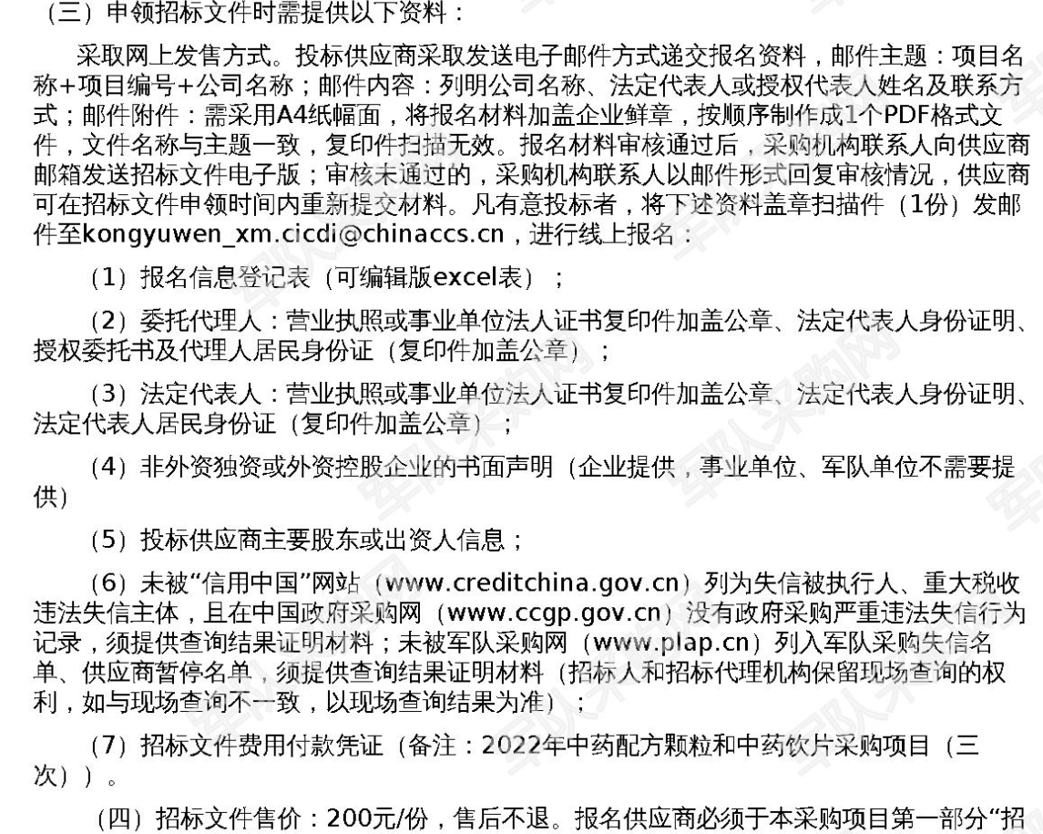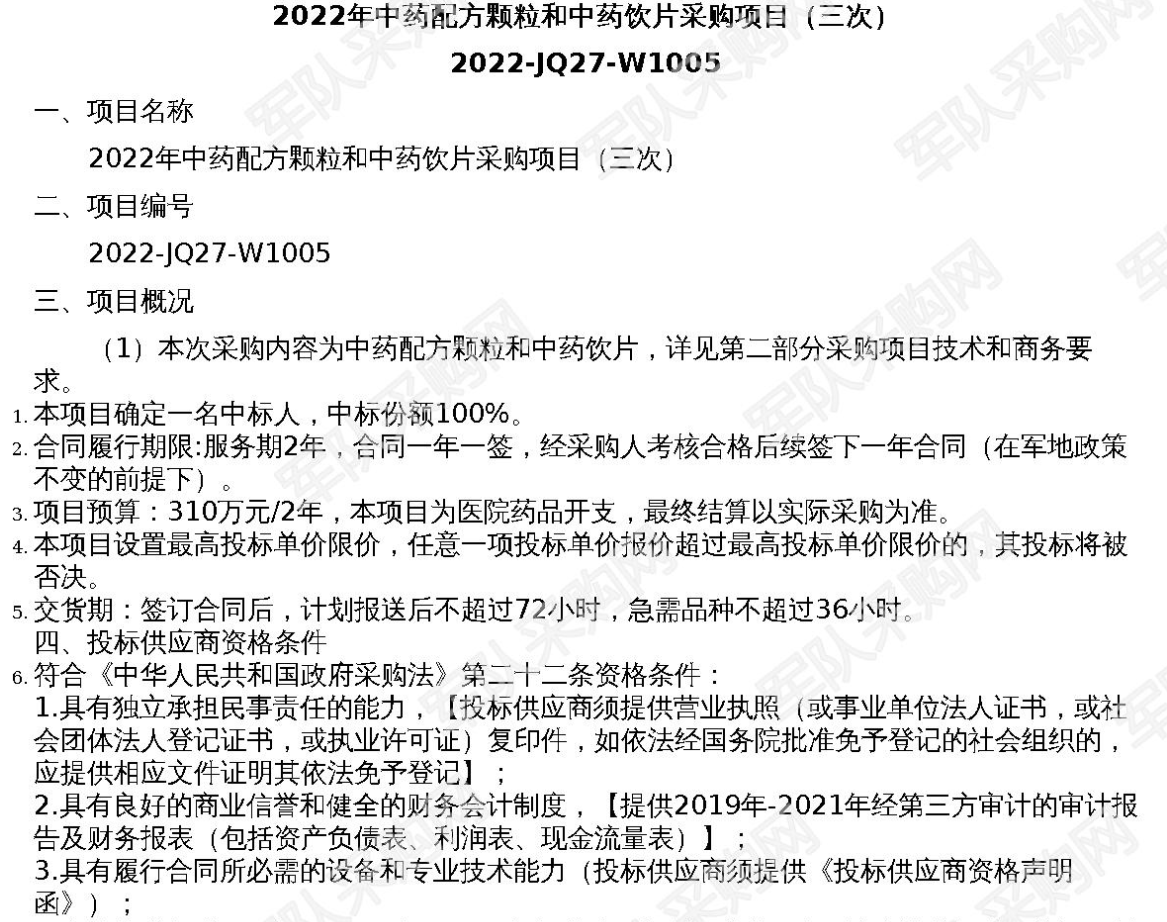 【军队采购】军队采购网2022年中药配方颗粒和中药饮片采购项目(三次)+2022-JQ27-W1005
