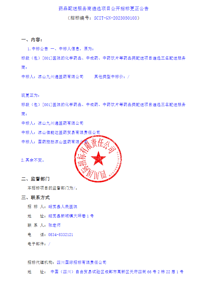 【凉山彝族自治州昭觉县人民医院】四川省凉山彝族自治州昭觉县人民医院药品配送服务商遴选项目公开招标更正公告