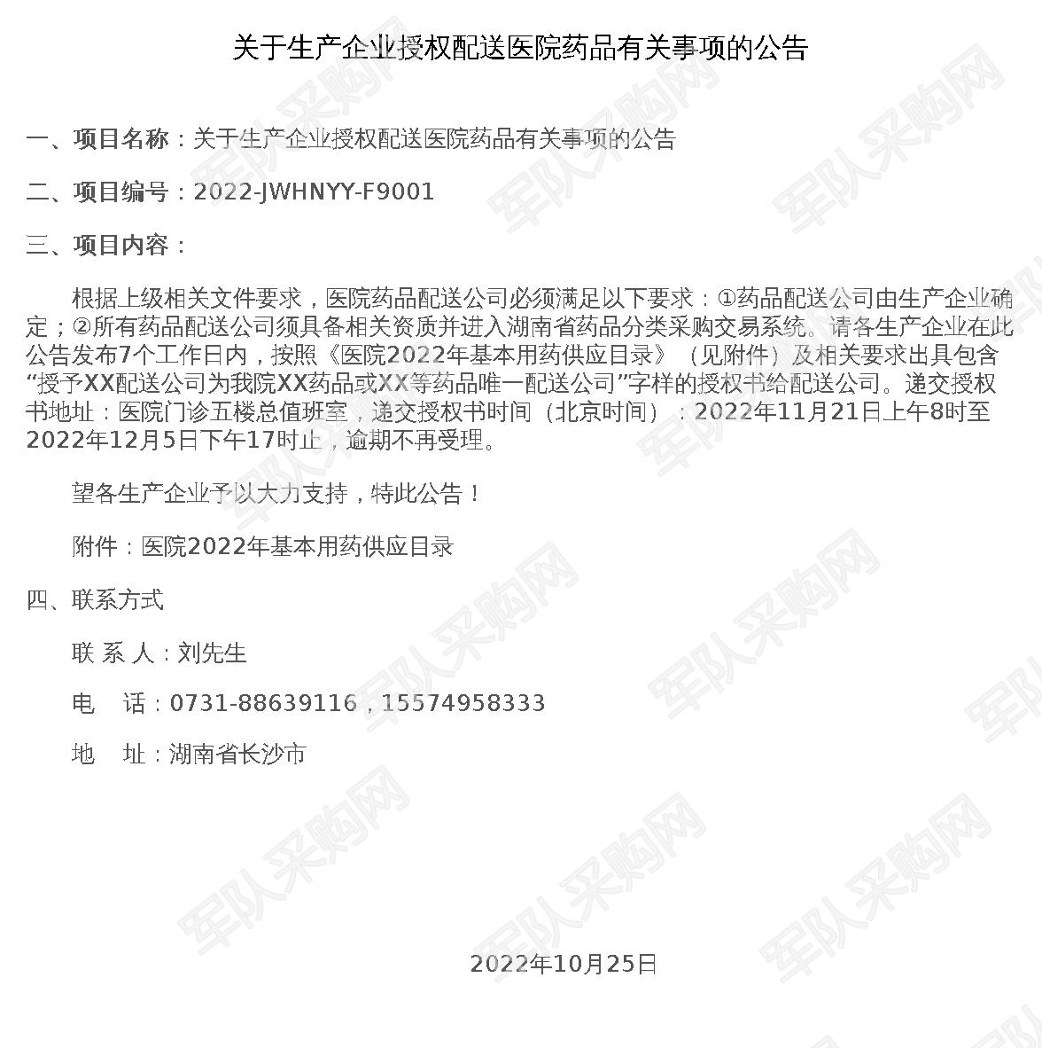 【军队采购网】关于生产企业授权配送医院药品有关事项的公告(2022-JWHNYY-F9001)
