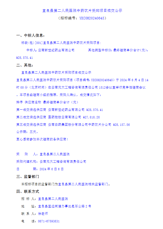 【昆明市宜良县第二人民医院】云南省昆明市宜良县第二人民医院中药饮片采购项目成交公示