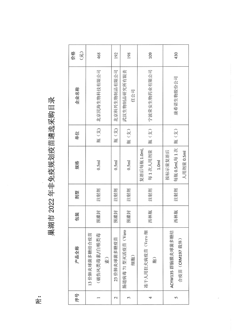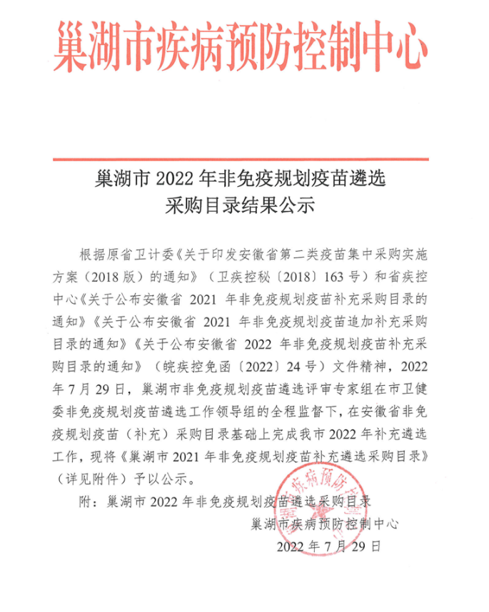 【合肥】安徽省合肥市巢湖市2022年非免疫规划疫苗遴选结果公示