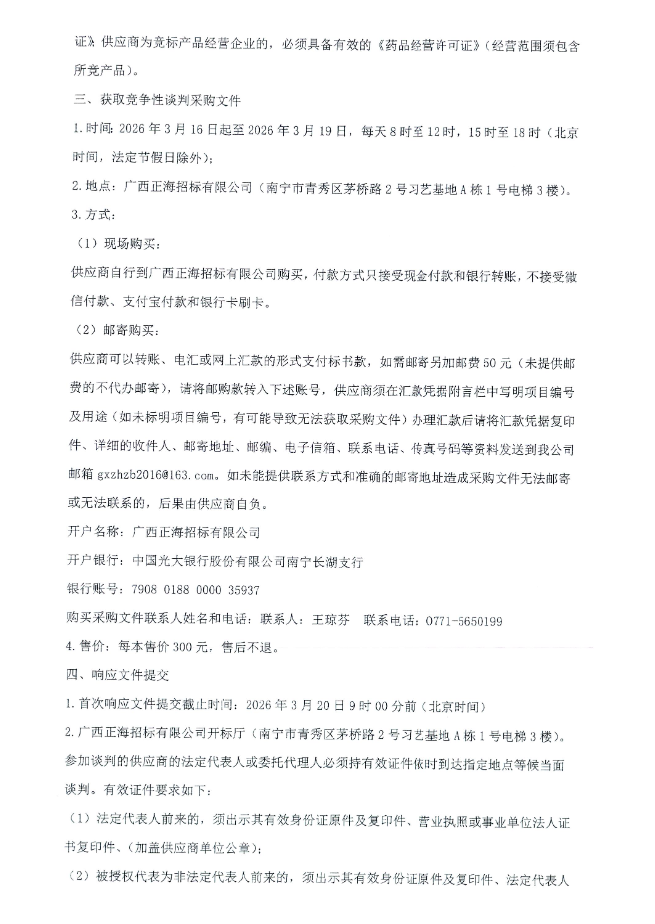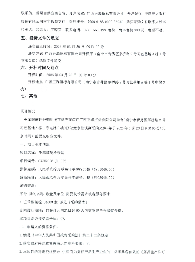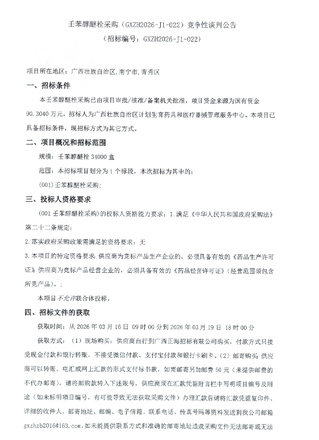 【广西壮族自治区计划生育药具和医疗器械管理服务中心】广西壮族自治区计划生育药具和医疗器械管理服务中心壬苯醇醚栓采购(GXZH2026-J1-022)竞争性谈判公告