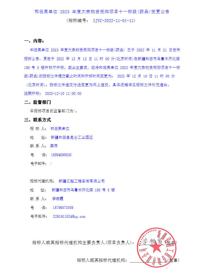 【和田某单位】新疆维吾尔自治区和田某单位2023年度大宗物资采购项目十一标段(药品)变更公告