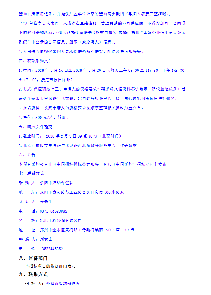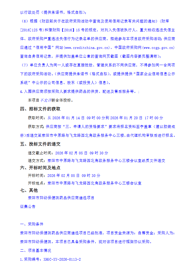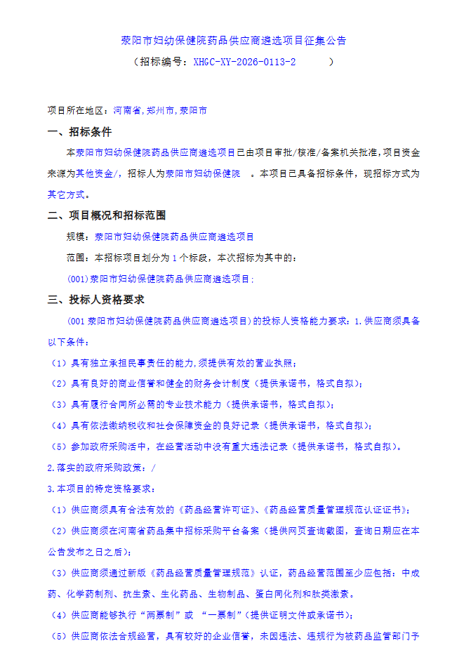 【郑州市荥阳市妇幼保健院】河南省荥阳市妇幼保健院药品供应商遴选项目征集公告