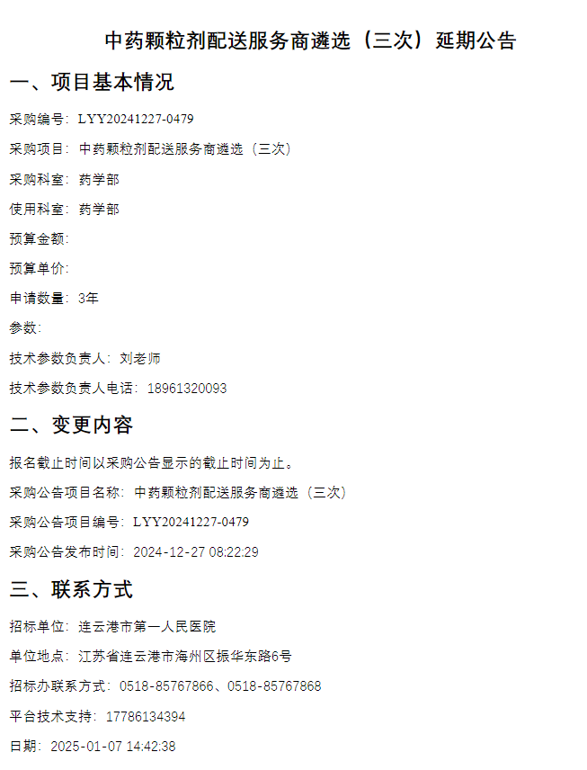 【连云港市第一人民医院】江苏省连云港市第一人民医院中药颗粒剂配送服务商遴选(三次)延期公告