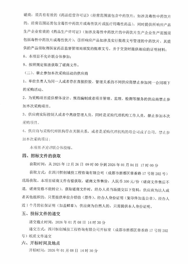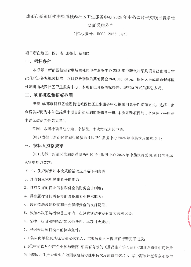 【成都市新都区桂湖街道城西社区卫生服务中心】 四川省成都市新都区桂湖街道城西社区卫生服务中心2026年中药饮片采购项目竞争性磋商采购公告