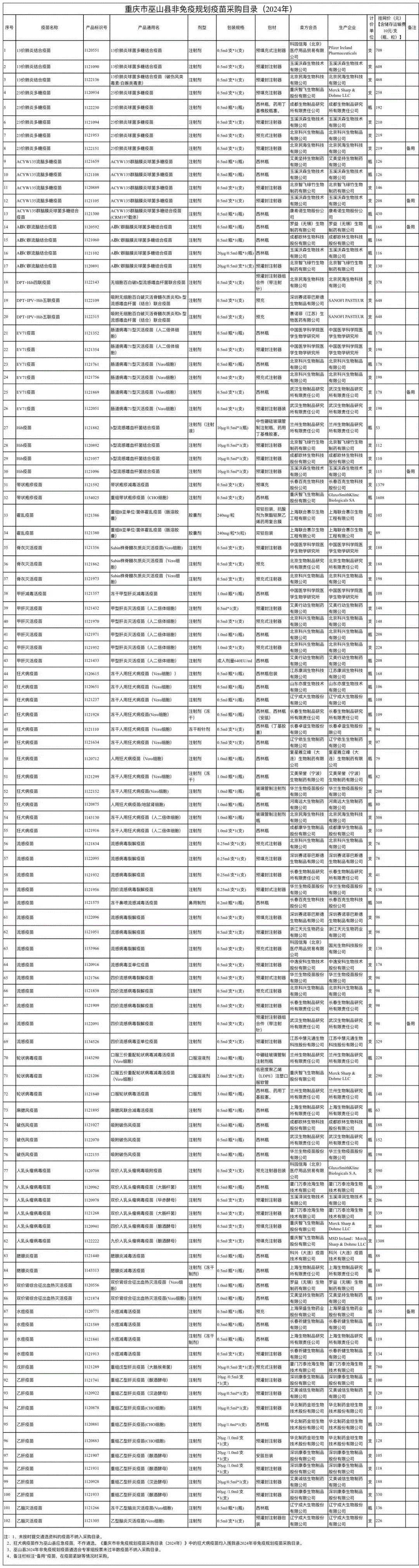 为贯彻落实《中华人民共和国疫苗管理法》,进一步规范我县非免疫规划疫苗采购和管理,按照《重庆市卫生健康委员会关于印发《重庆市非免疫规划疫苗集中采购实施方案(试行)》的通知》(渝卫发〔2023〕5号)《重庆市疾病预防控制中心关于印发<重庆市非免疫规划疫苗遴选指导意见(试行)>的通知》(渝疾控办〔2023〕181号)要求,坚持依法依规、需求导向、公平公开、集体讨论的原则,在县卫生健康委的监督下,我中心于7月19日召开了巫山县2024-2025年度非免疫规划疫苗遴选工作会。现将重庆市巫山县非免疫规划疫苗采购目录(2024年)公示如下。