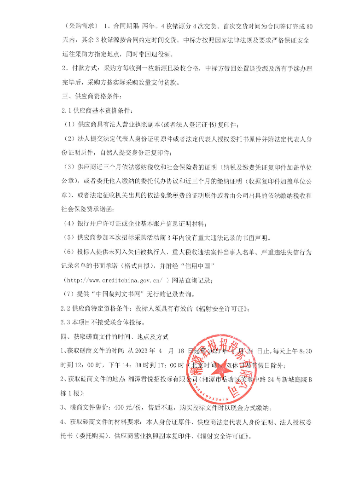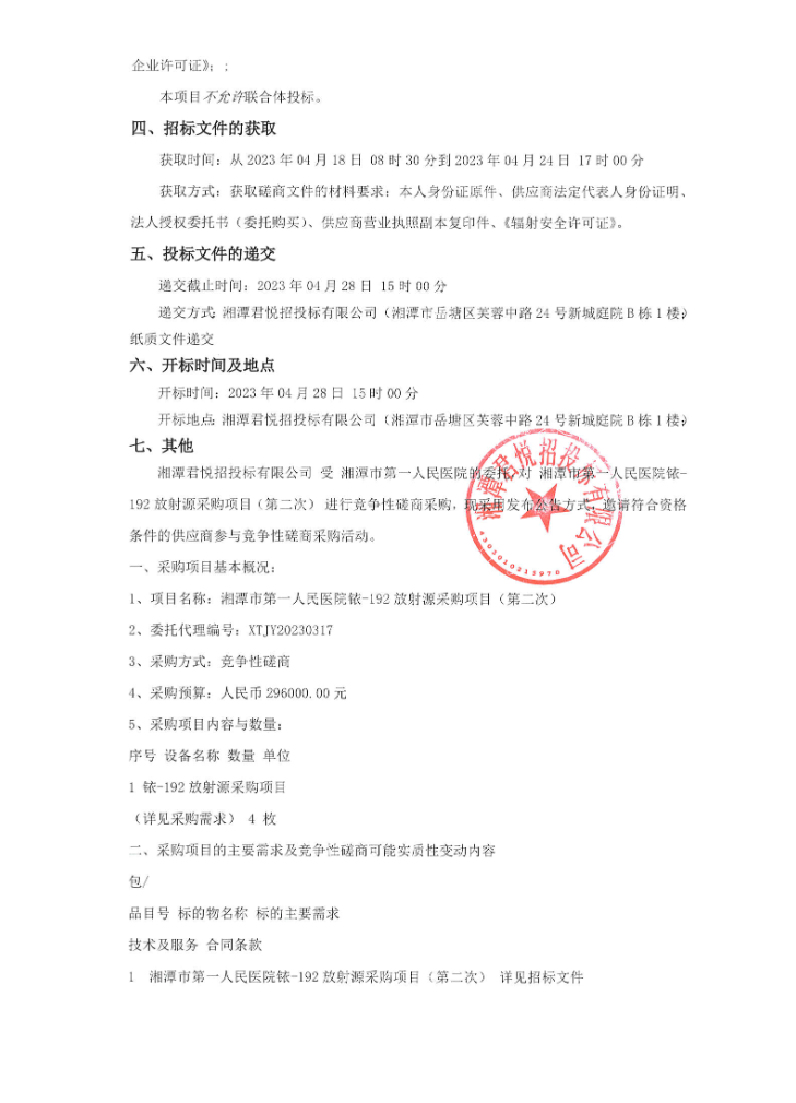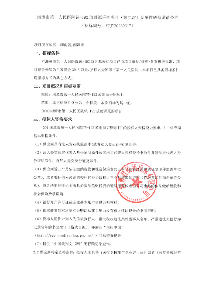 【湘潭市第一人民医院】湖南省湘潭市第一人民医院铱-192放射源采购项目(第二次)竞争性磋商邀请公告