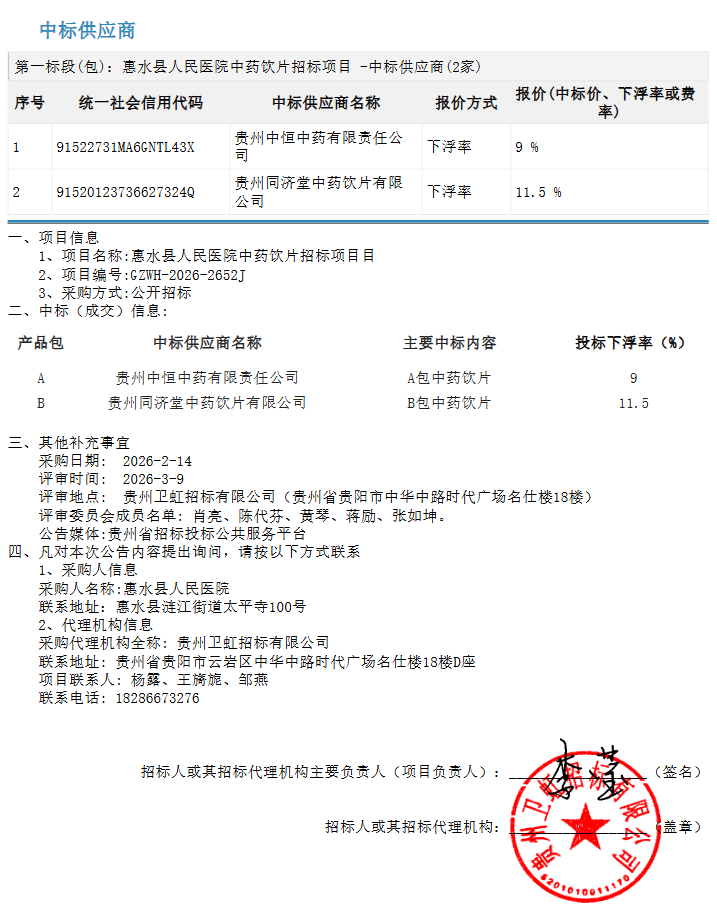 【黔南布依族苗族自治州惠水县人民医院】贵州省惠水县人民医院中药饮片招标项目中标(成交)公告