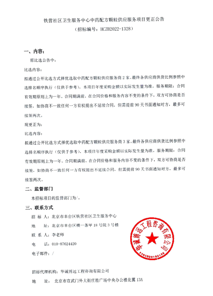 【北京市丰台区铁营社区卫生服务中心】北京市丰台区铁营社区卫生服务中心中药配方颗粒供应服务项目更正公告