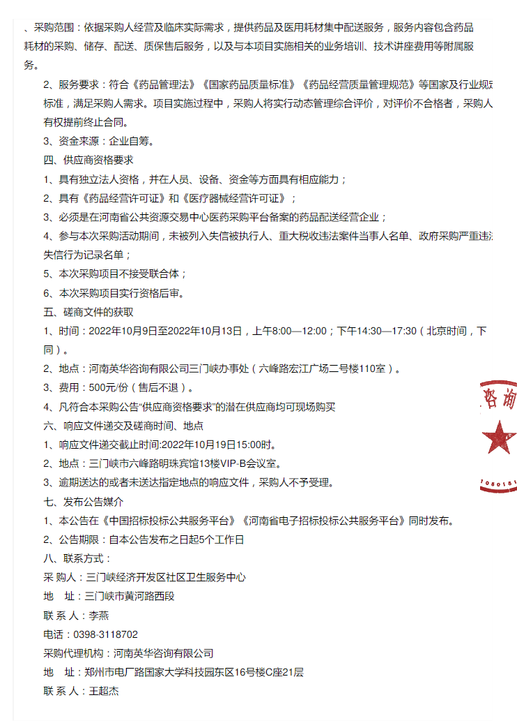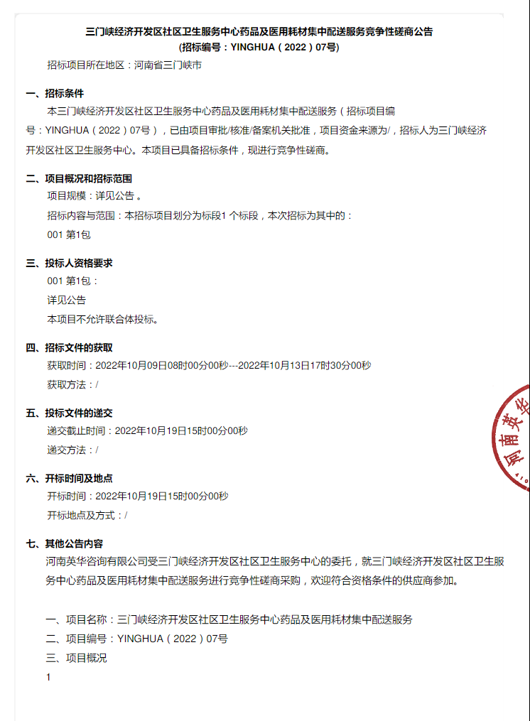 【河南省三门峡经济开发区社区卫生服务中心】药品及医用耗材集中配送服务竞争性磋商公告