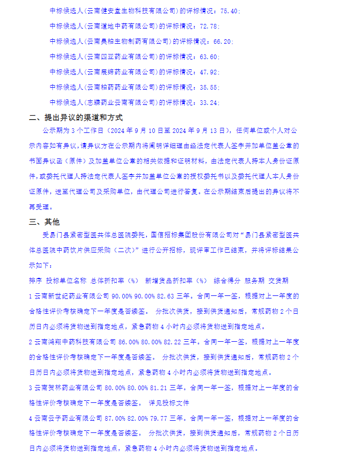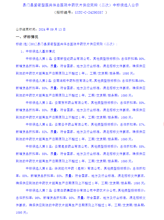 【玉溪市易门县紧密型医共体总医院】云南省玉溪市易门县紧密型医共体总医院中药饮片供应采购(二次)中标候选人公示