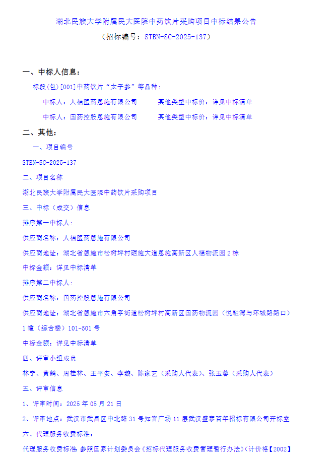 【湖北民族大学附属民大医院】湖北民族大学附属民大医院中药饮片采购项目中标结果公告