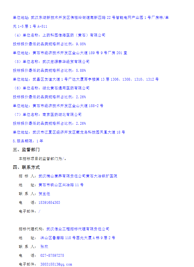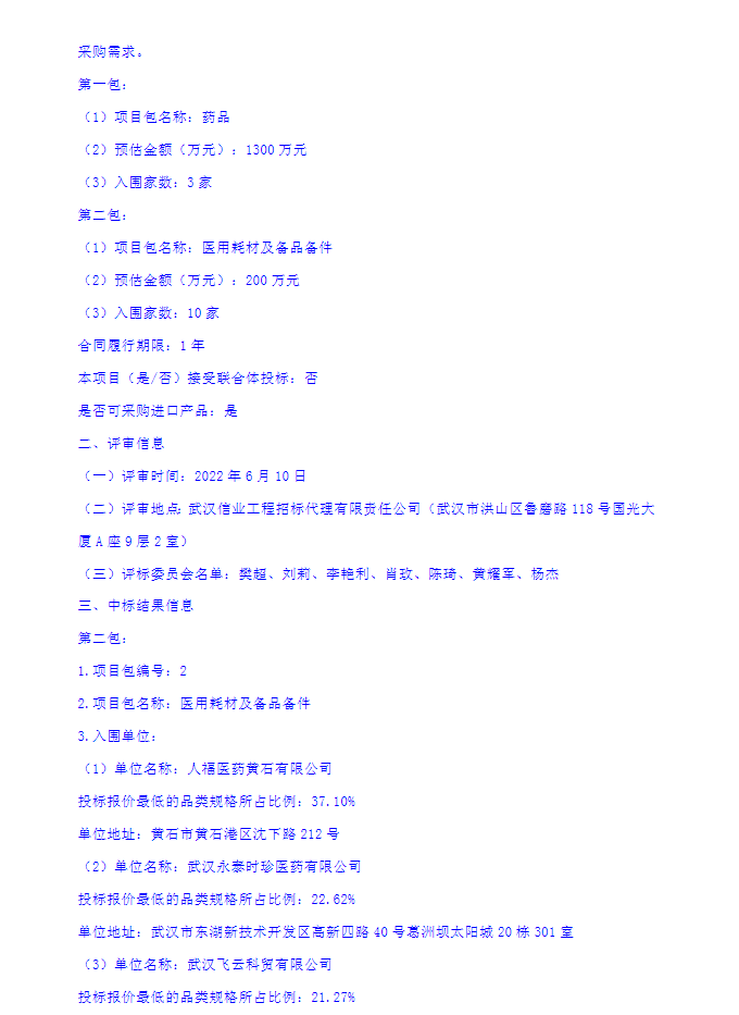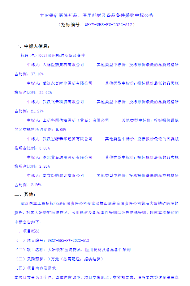 【大冶铁矿医院】大冶铁矿医院药品、医用耗材及备品备件采购中标公告