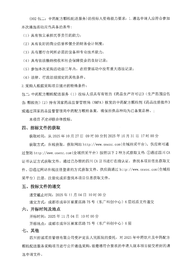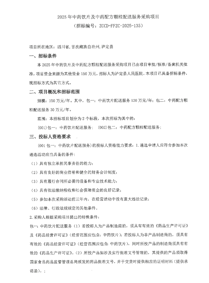 【甘孜藏族自治州泸定县人民医院】四川省甘孜藏族自治州泸定县人民医院2025年中药饮片及中药配方颗粒配送服务采购项目