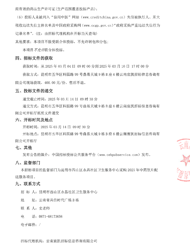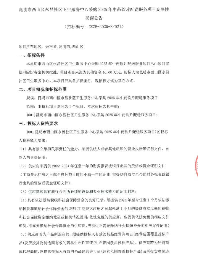 【昆明市西山区永昌社区卫生服务中心】云南省昆明市西山区永昌社区卫生服务中心采购2025年中药饮片配送服务项目竞争性磋商公告