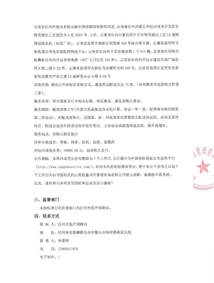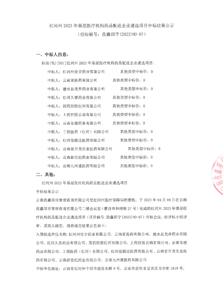 【红河州医疗保障局】云南省红河州2023年基层医疗机构药品配送企业遴选项目中标结果公示