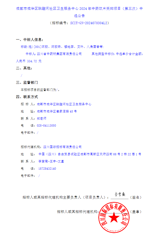 【成都市成华区跳蹬河社区卫生服务中心】四川省成都市成华区跳蹬河社区卫生服务中心2024年中药饮片采购项目(第三次)中选公告