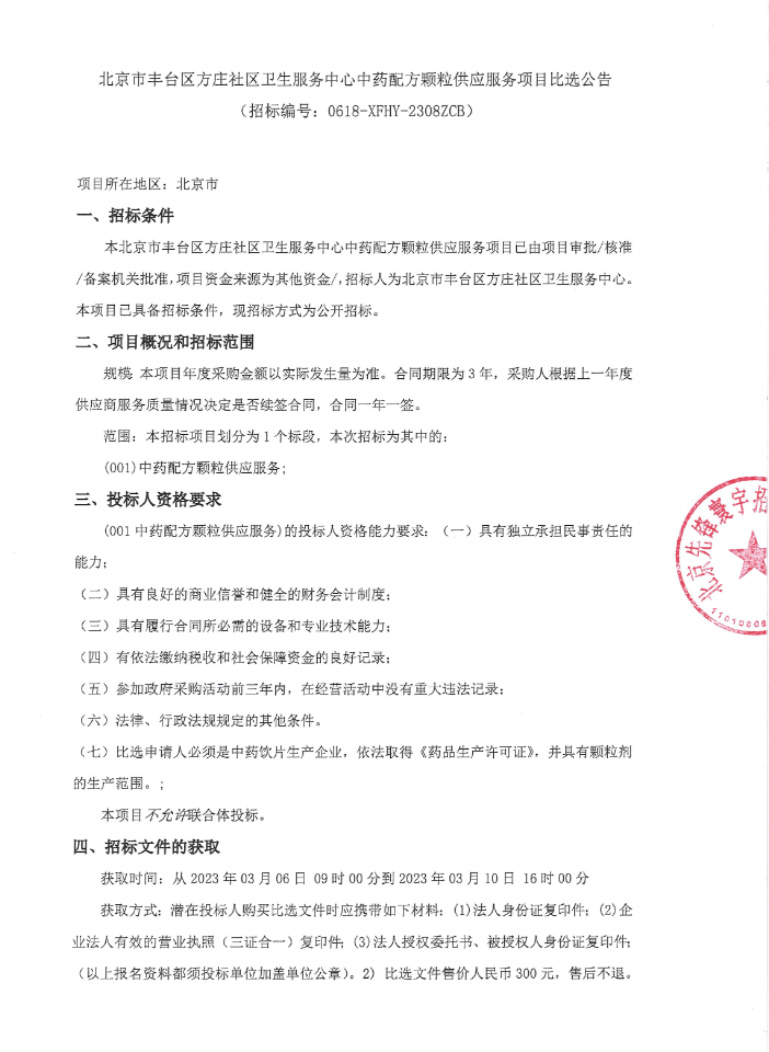 【北京市丰台区方庄社区卫生服务中心】北京市丰台区方庄社区卫生服务中心中药配方颗粒供应服务项目比选公告