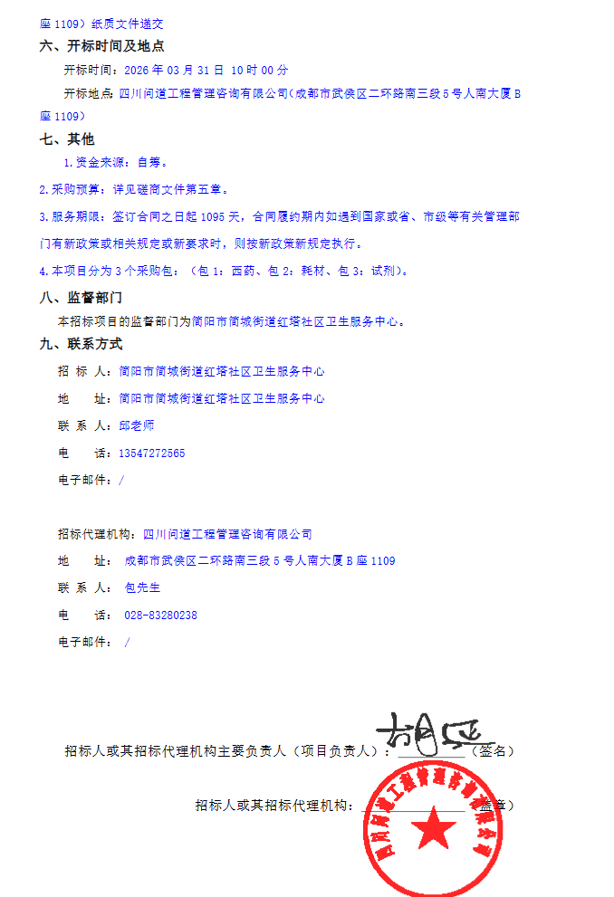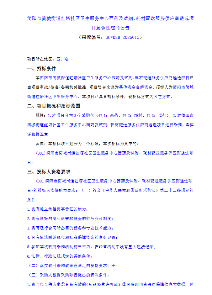 【成都市简阳市简城街道红塔社区卫生服务中心】四川省简阳市简城街道红塔社区卫生服务中心西药及试剂、耗材配送服务供应商遴选项目竞争性磋商公告