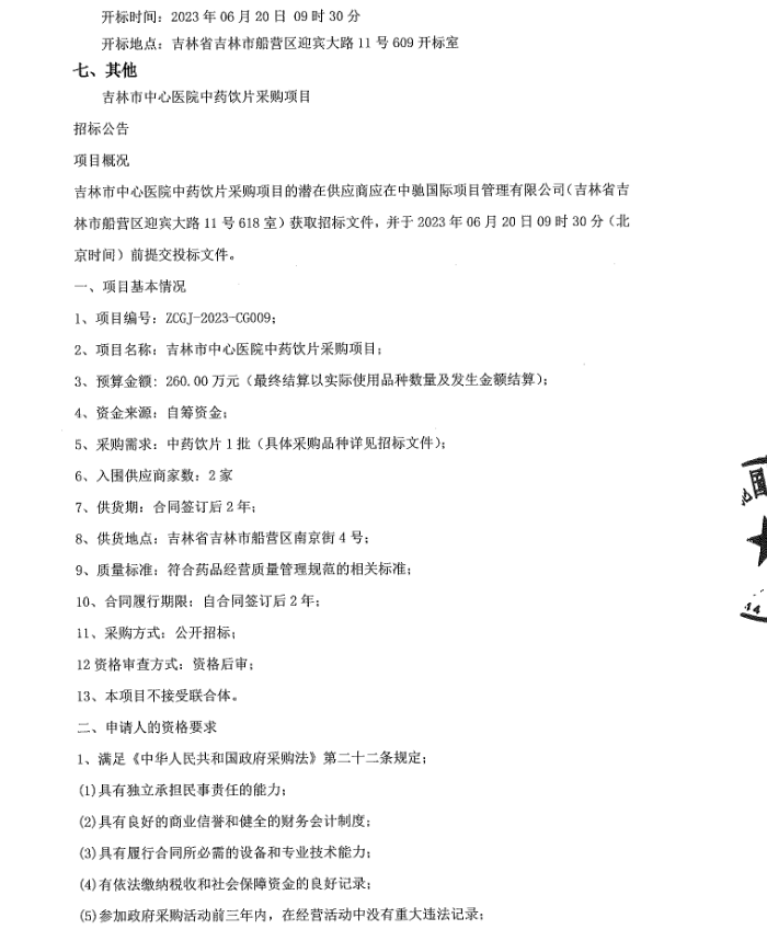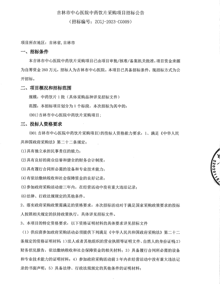 【吉林市中心医院】吉林省吉林市中心医院中药饮片采购项目招标公告