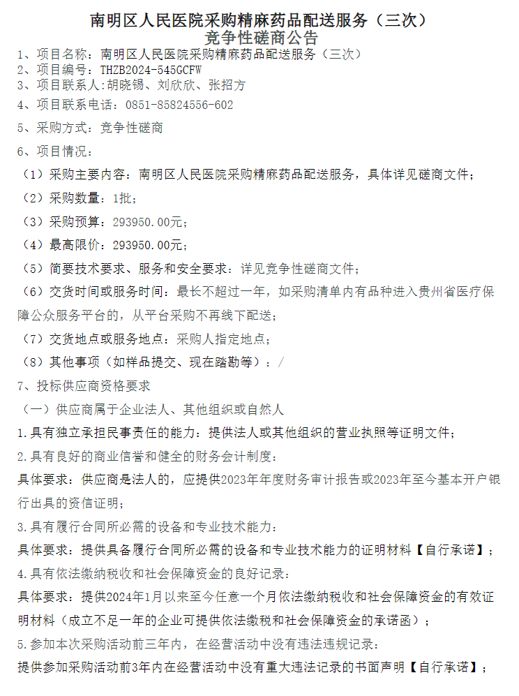 【贵阳市南明区人民医院】贵州省贵阳市南明区人民医院采购精麻药品配送服务(三次)竞争性磋商公告
