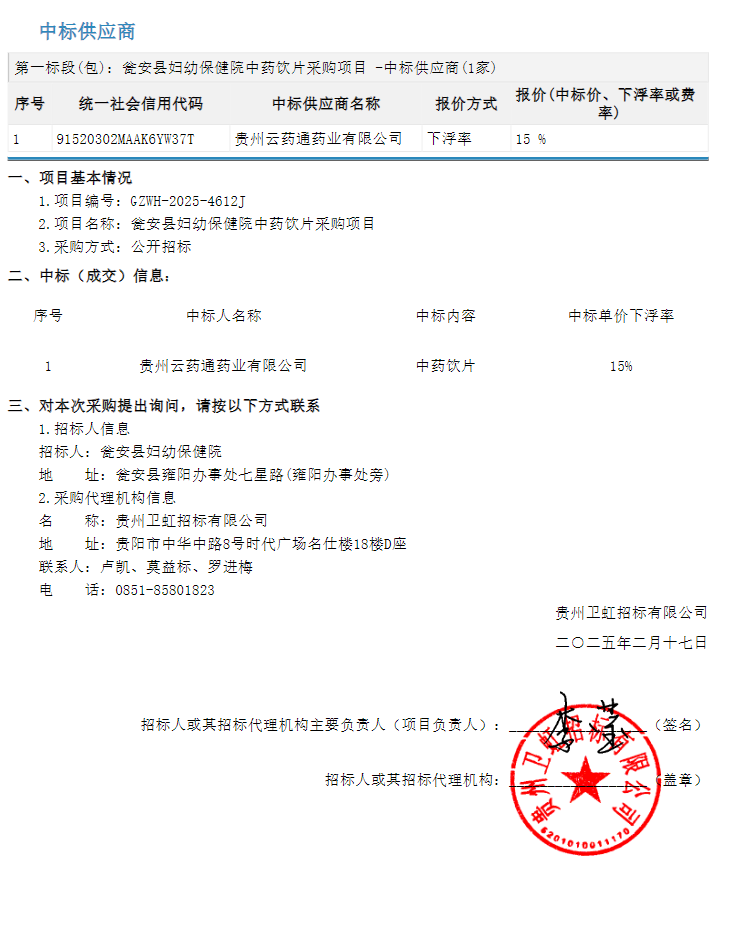 【黔南布依族苗族自治州瓮安县妇幼保健院】贵州省黔南布依族苗族自治州瓮安县妇幼保健院中药饮片采购项目中标公告