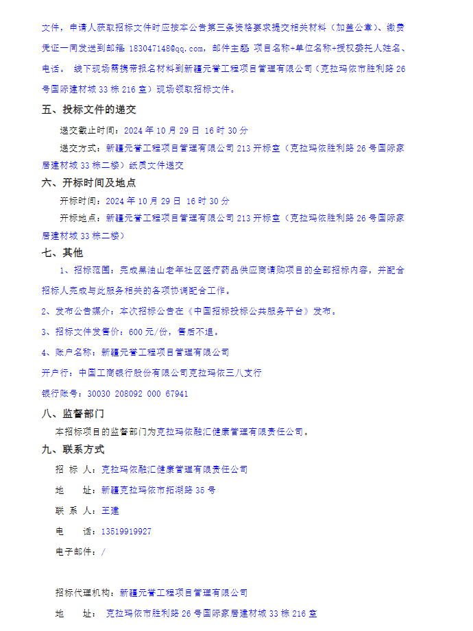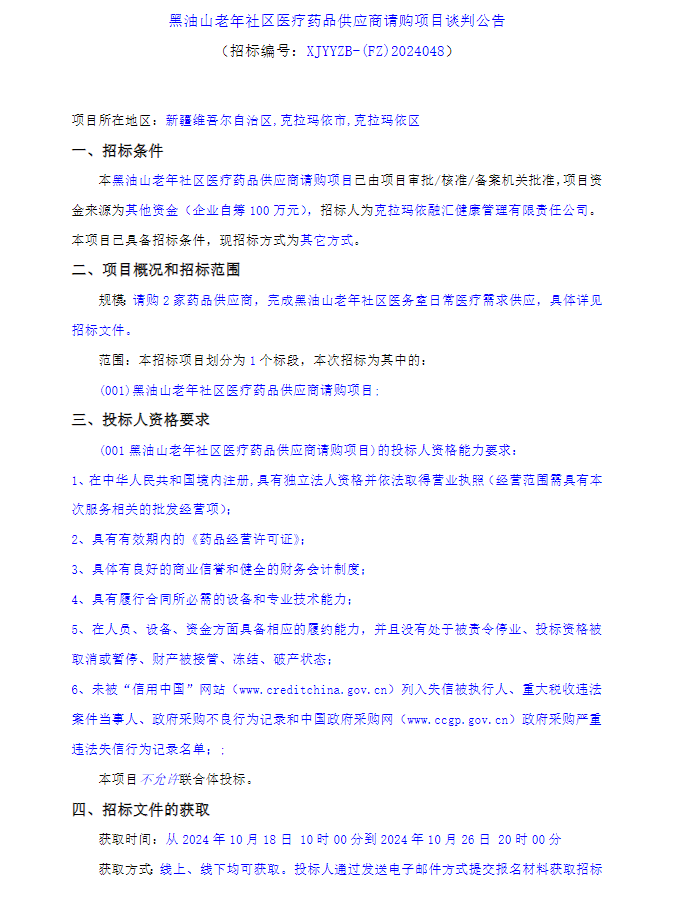 【克拉玛依市黑油山老年社区】新疆维吾尔自治区克拉玛依市黑油山老年社区医疗药品供应商请购项目谈判公告