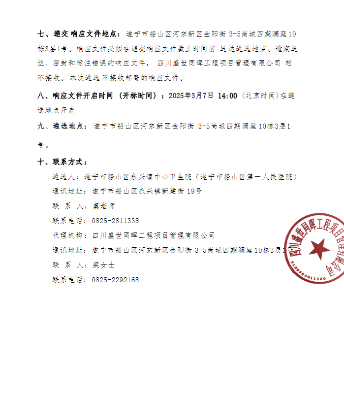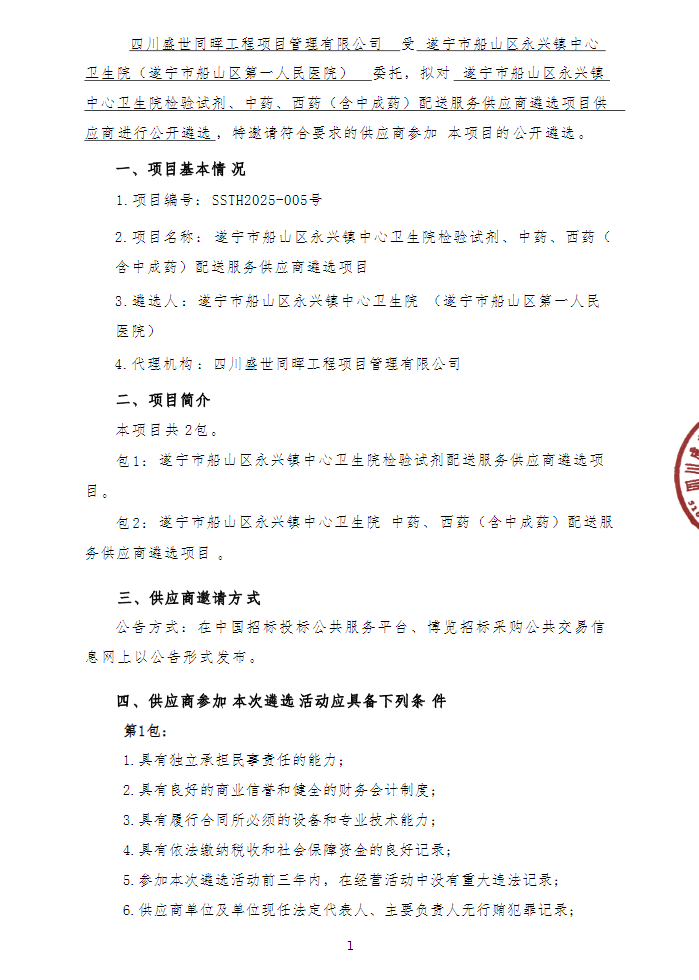【遂宁市船山区永兴镇中心卫生院】四川省遂宁市船山区永兴镇中心卫生院检验试剂、中药、西药(含中成药)配送服务供应商遴选项目首次公告