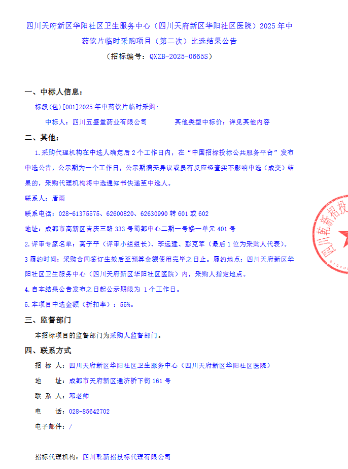 【四川天府新区华阳社区卫生服务中心】四川天府新区华阳社区卫生服务中心(四川天府新区华阳社区医院)2025年中药饮片临时采购项目(第二次)比选结果公告