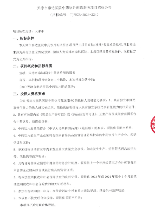 【天津市泰达医院】天津市泰达医院中药饮片配送服务项目招标公告