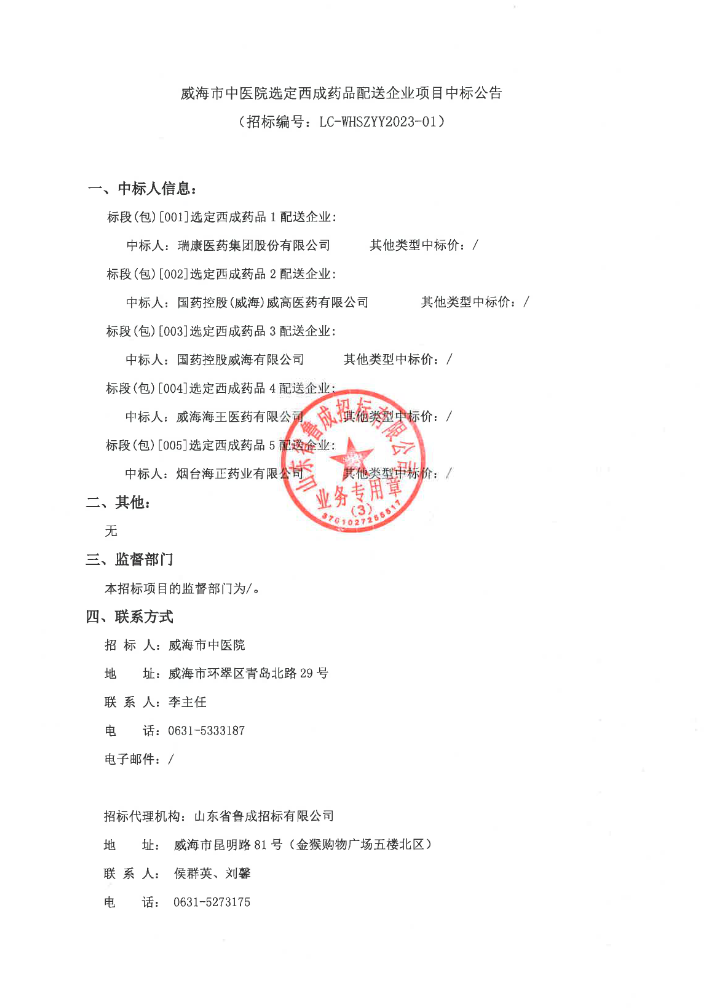 【威海市中医院】山东省威海市中医院选定西成药品配送企业项目中标公告