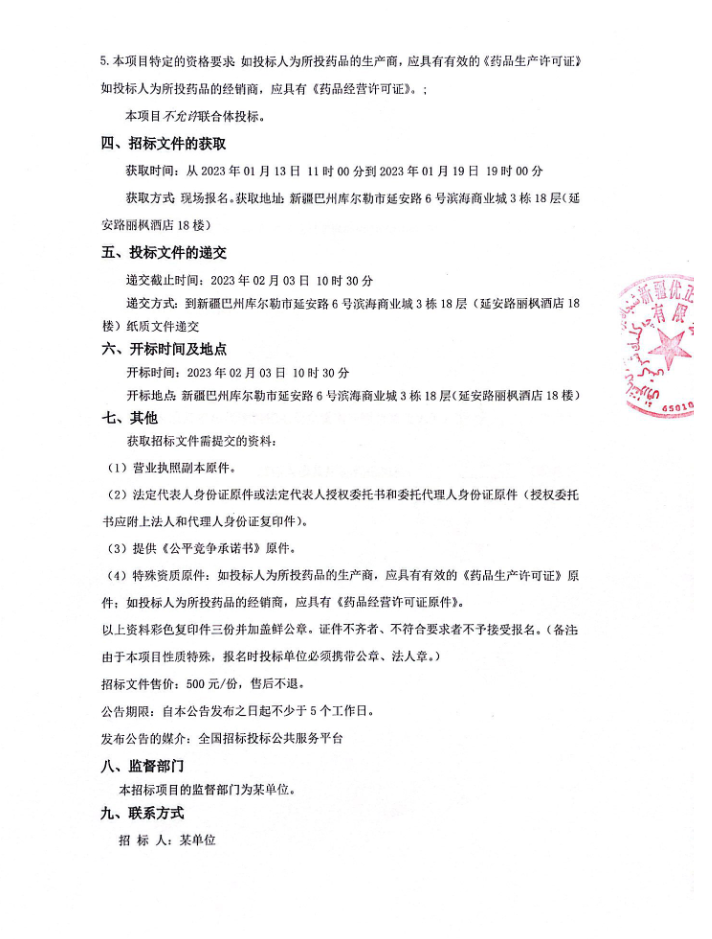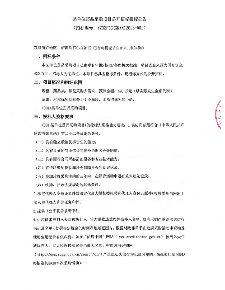 【库尔勒市某单位】新疆维吾尔自治区巴音郭楞蒙古自治州库尔勒市某单位药品采购项目公开招标招标公告