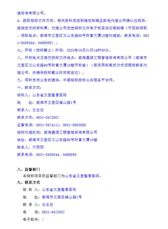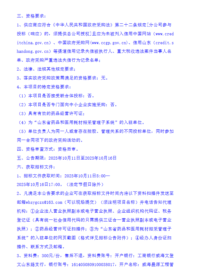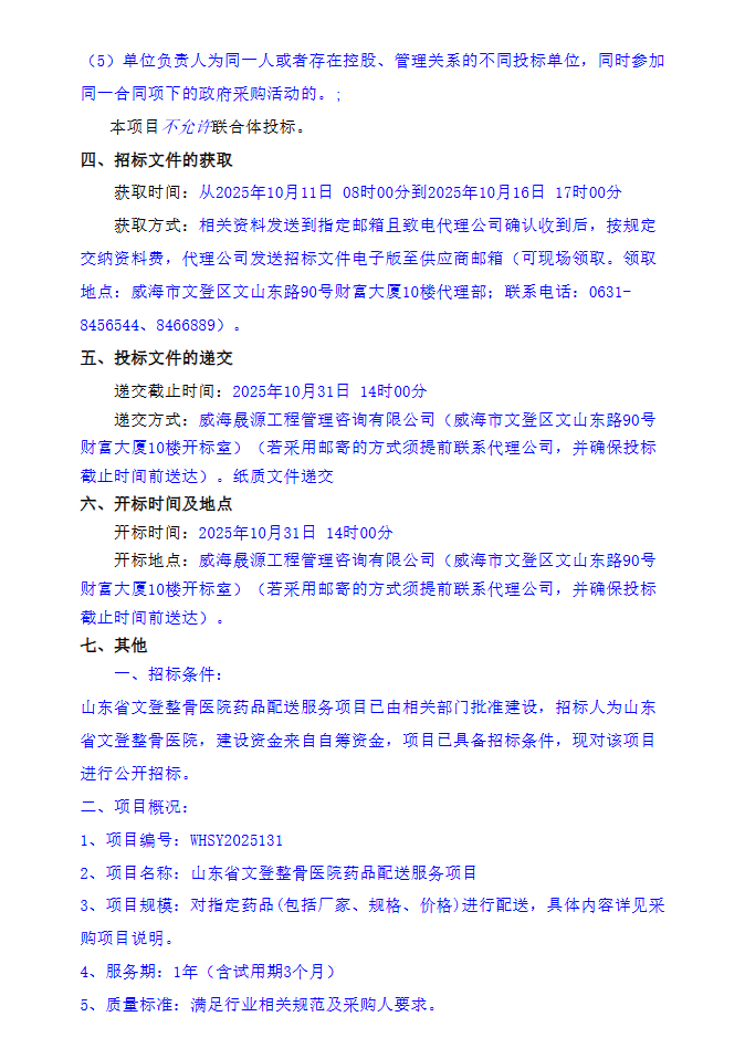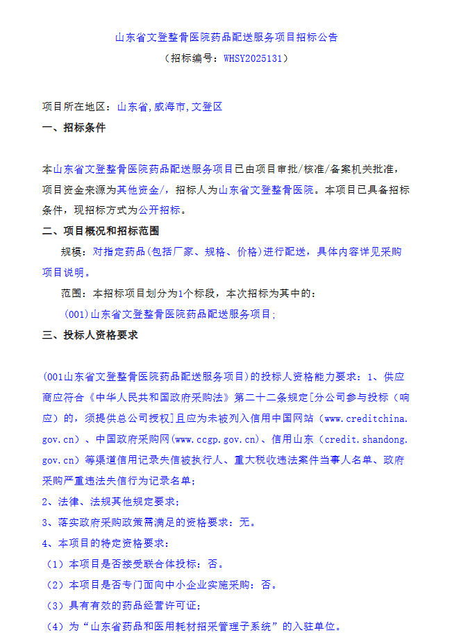 【山东省文登整骨医院】山东省文登整骨医院药品配送服务项目招标公告