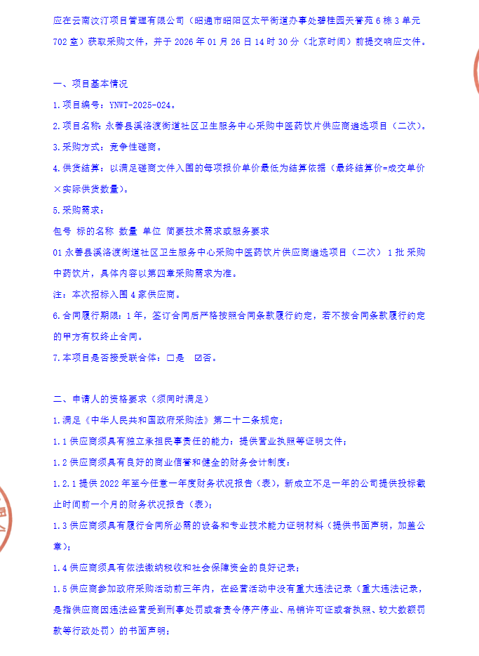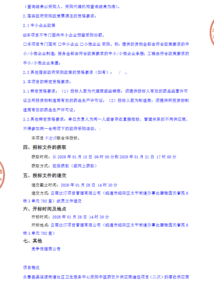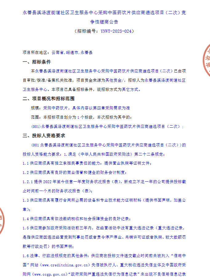【昭通市永善县溪洛渡街道社区卫生服务中心】云南省永善县溪洛渡街道社区卫生服务中心采购中医药饮片供应商遴选项目(二次)竞争性磋商公告