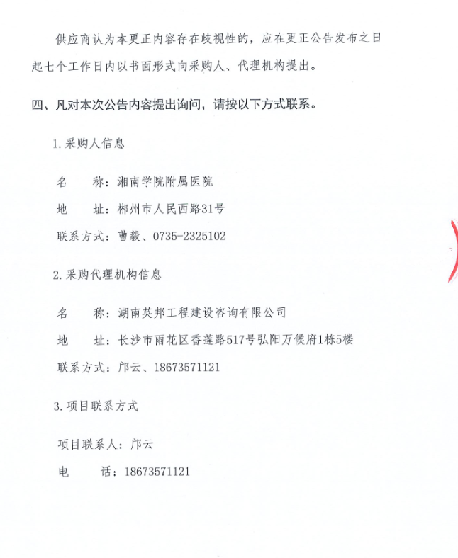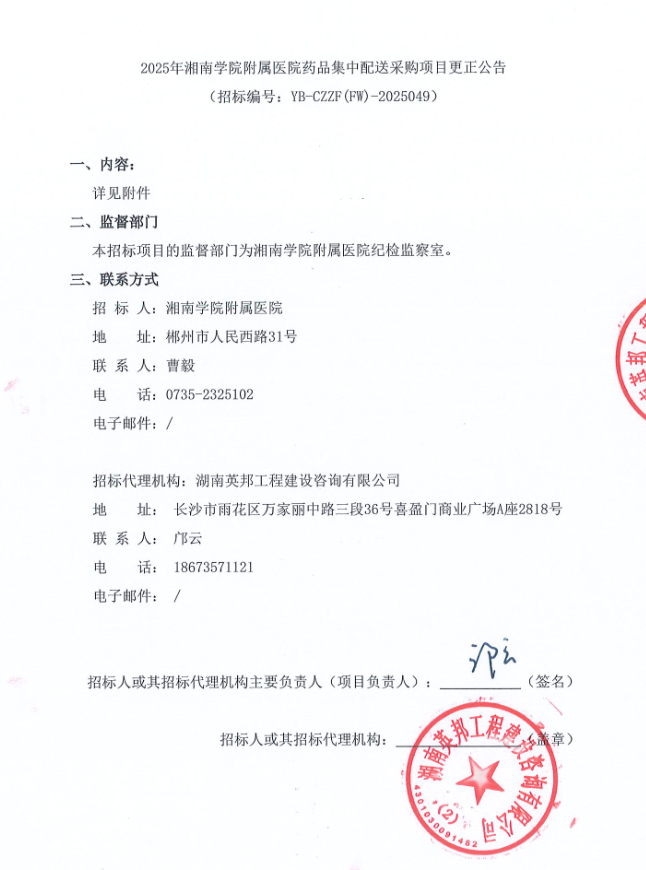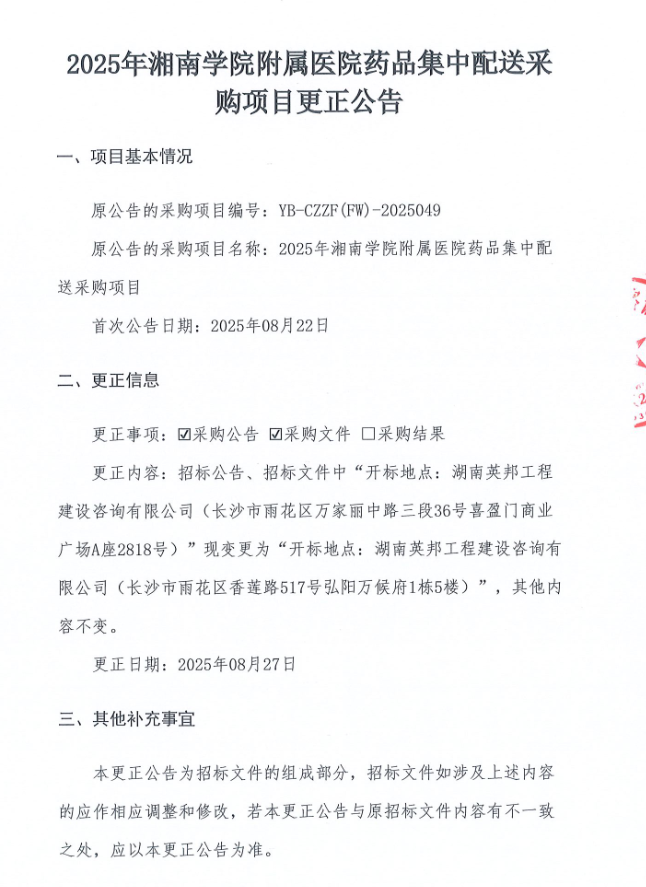 【郴州市湘南学院附属医院】湖南省2025年湘南学院附属医院药品集中配送采购项目更正公告