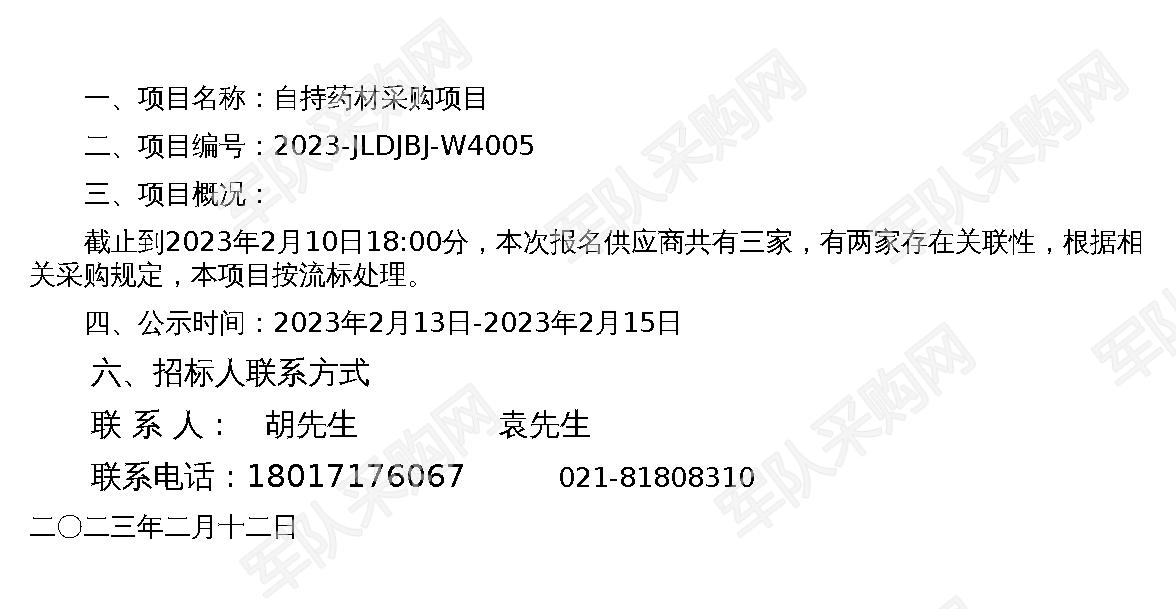 【军队采购】军队采购网自持药材采购项目流标公告(2023-JLDJBJ-W4005)