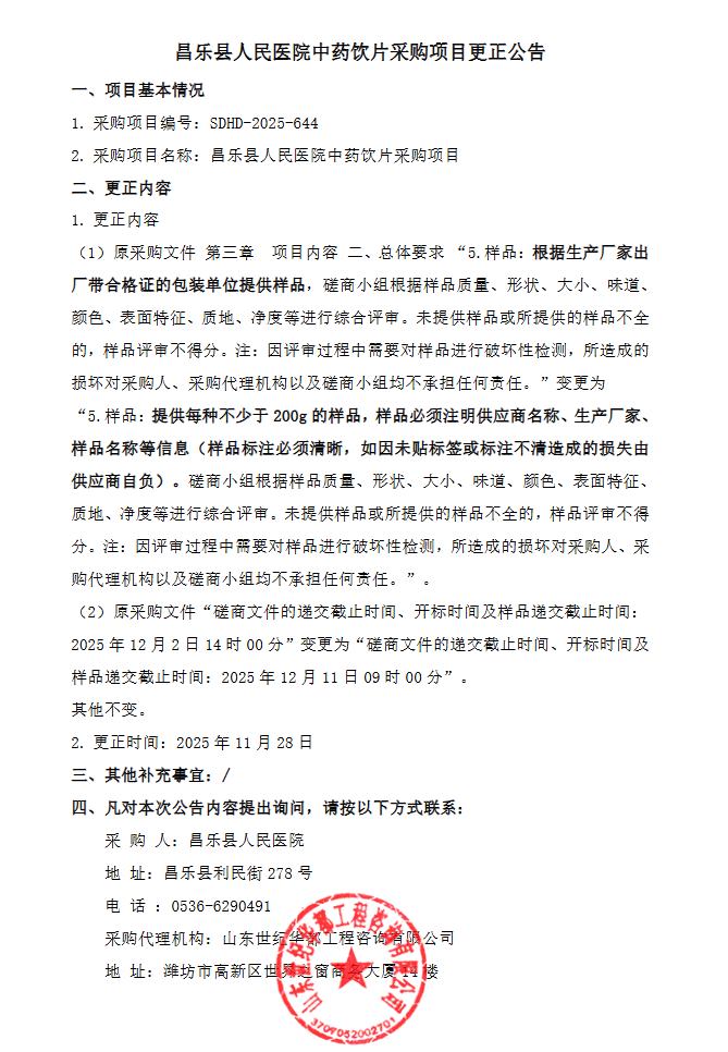【潍坊市昌乐县人民医院】山东省潍坊市昌乐县人民医院中药饮片采购项目更正公告