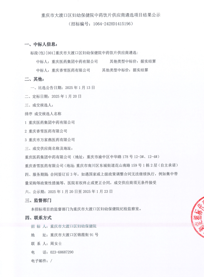 【重庆市大渡口区妇幼保健院】重庆市大渡口区妇幼保健院中药饮片供应商遴选项目结果公示