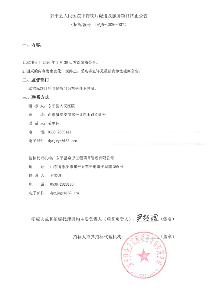 【泰安市东平县人民医院】山东省泰安市东平县人民医院中药饮片配送及服务项目终止公告