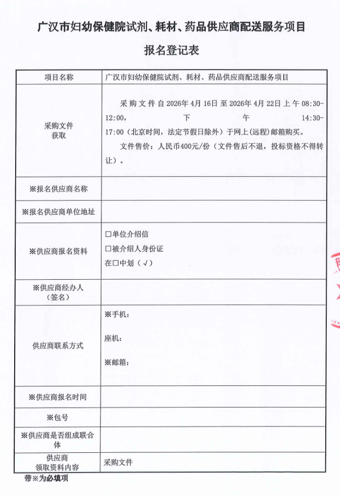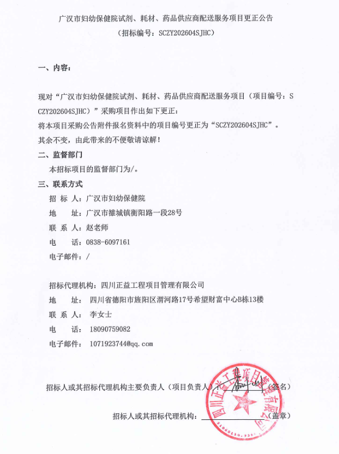 【德阳市广汉市妇幼保健院】四川省广汉市妇幼保健院试剂、耗材、药品供应商配送服务项目更正公告