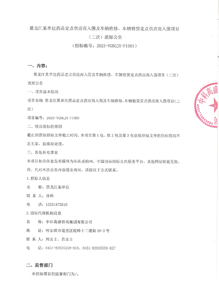【黑龙江某单位】黑龙江某单位药品定点供应商入围及车辆维修、车辆租赁定点供应商入围项目(二次)流标公告