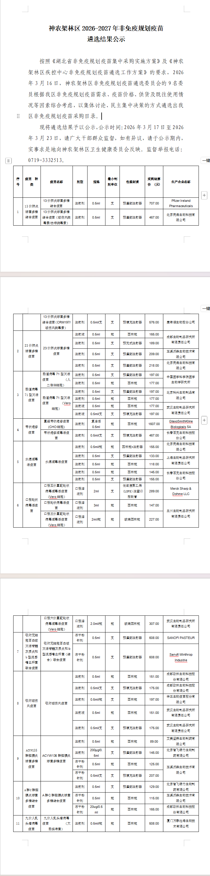 【十堰】神农架林区2026-2027年非免疫规划疫苗遴选结果公示