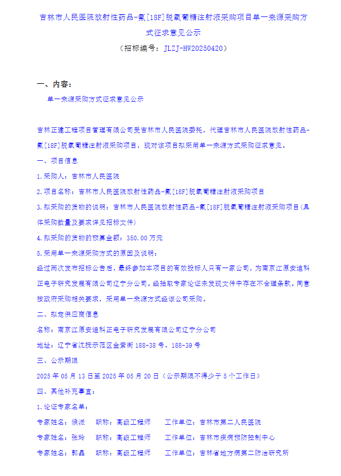 【吉林市人民医院】吉林省吉林市人民医院放射性药品-氟[18F]脱氧葡糖注射液采购项目单一来源采购方式征求意见公示