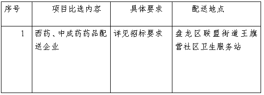 1、项目概况:药品配送企业遴选,通过综合评估打分,遴选出1家药品配送企业作为补充为盘龙区人民医院王旗营社区卫生服务站所用药品(包括基本药物)提供配送服务。医院根据其提供药品、服务质量及配送时间来选择采购相应的药品。