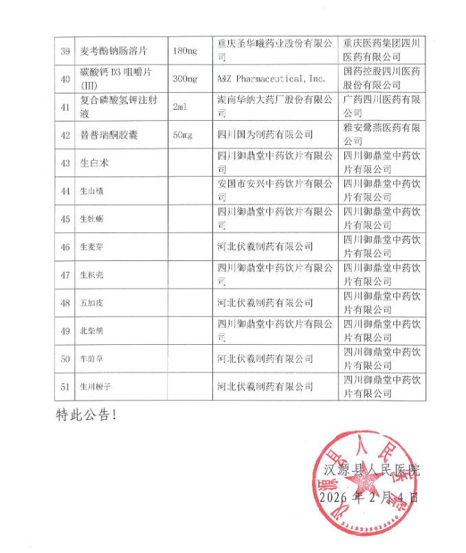【雅安市汉源县人民医院】四川省雅安市汉源县人民医院新药遴选结果公告