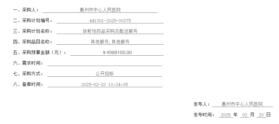 【惠州市中心人民医院】广东省惠州市中心人民医院放射性药品采购及配送服务